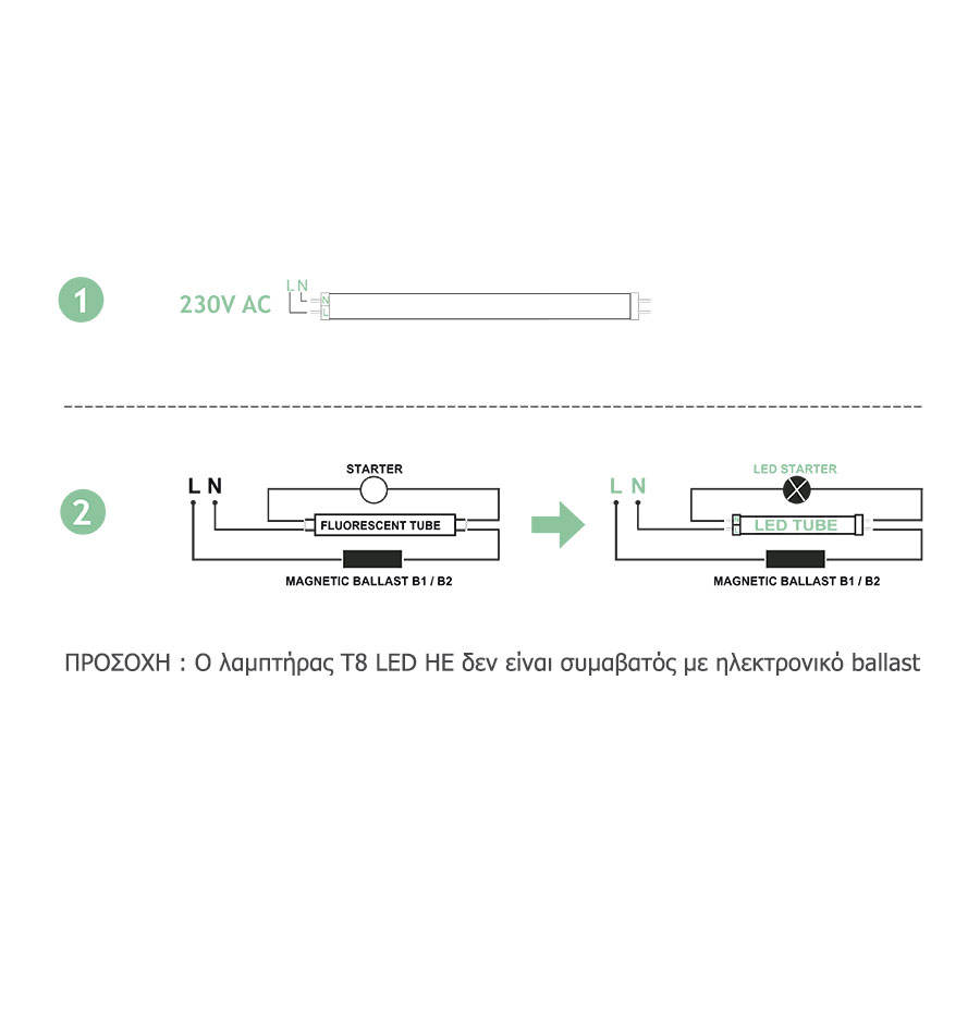 Η λάμπα LED TUBE Τ8 λειτουργεί με 2 τρόπους σύνδεσης: