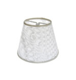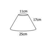 Καπέλο κωνικό στρογγυλό με διάμετρο 25cm στο κάτω μέρος και 11cm στό πάνω μέρος. Διαθέτει ύψος 17cm και είναι κατασκευασμένο από ύφασμα με εσωτερικό pvc. Η χρήση του καπέλου είναι για τοποθέτηση σε επιτραπέζιο φωτιστικό και η υποδοχή στήριξης είναι 32mm για ντουί Ε14.