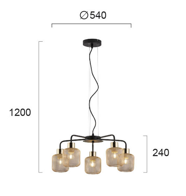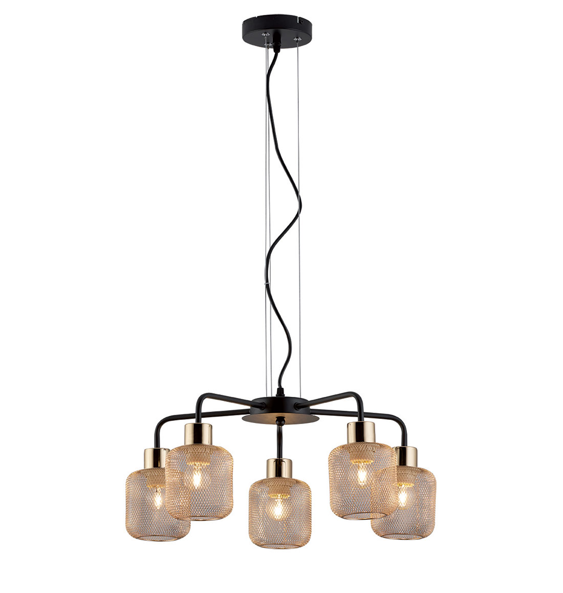 Vintage κρεμαστό φωτιστικό 5 φωτο Loren 4165500 από την εταιρεία Viokef από μεταλλική κατασκευή με πλέγμα καπέλο σε χρυσό ματ και ανάρτηση μαύρη. Κατάλληλο τόσο για οικιακό όσο και επαγγελματικό χώρο. Με διάμετρο 54 εκατοστά και ύψος έως 120 εκατοστά και ύψος καπέλου 24 εκατοστά.